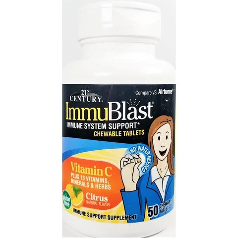 Take a blast of vitamin C in combination with 13 vitamins, minerals and herbs for your immune system health when you feel you need extra support. 21st Century ImmuBlast chewable tablets can be taken conveniently without water. Just chew four tablets and continue with your busy day. Our natural citrus flavored chewable tablets taste great too! Four chewable tablets (one serving) contain 1,000mg of vitamin C for immune support, antioxidant vitamins A, C and E, essential antioxidant minerals zinc and selenium, beneficial herbs in a proprietary extract blend. No added yeast or preservatives. Gluten free. This statement has not been evaluated by the Food and Drug Administration. This product is not intended to diagnose, treat, cure, or prevent any disease. Airborne is a registered trademark of Airborne Health, Inc.