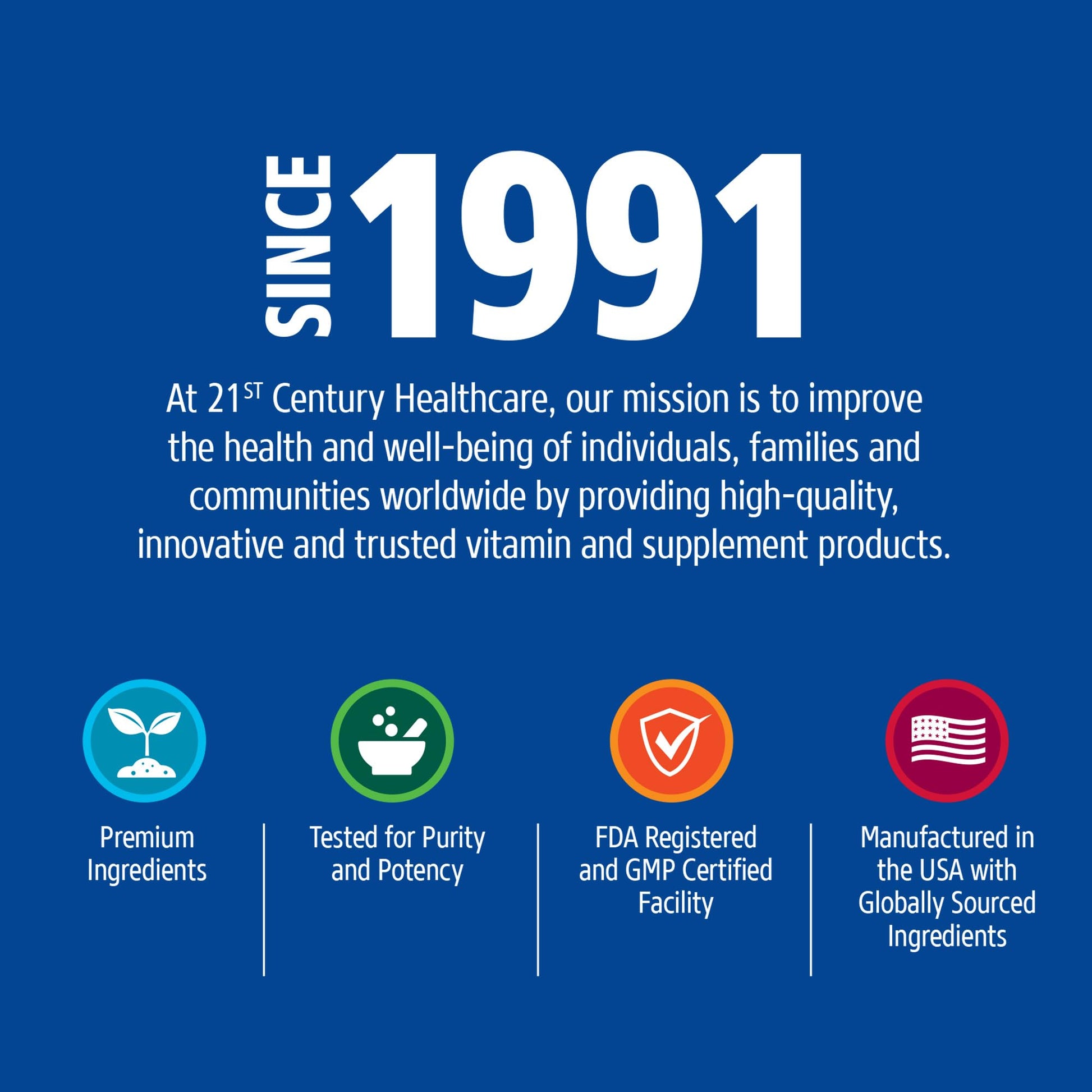 - GUARANTEED QUALITY: 21st Century HealthCare manufactures over 500 vitamins and nutritional supplements that are trusted to be 100% safe, contain the purest ingredients and are guaranteed for label potency.