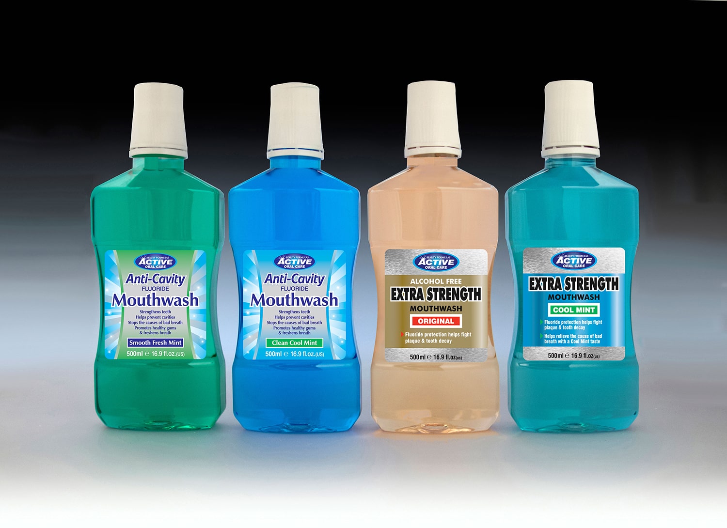 A range of four mouthwashes containing two flavours of anti-cavity and two flavours of extra strength