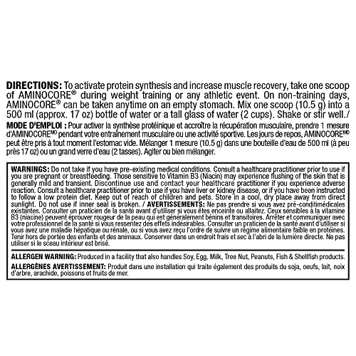 Details: Aminocore is a delicious, easy-to-mix branched chain amino acid matrix (BCAAs) that provides a whopping 8, 180 mg of BCAAs and 7 different forms of anabolic-supporting B vitamins per serving. Every serving delivers a pure 9: 6: 5 ratio of BCAA powder that immediately increases your body's ability to build hard, lean muscle.