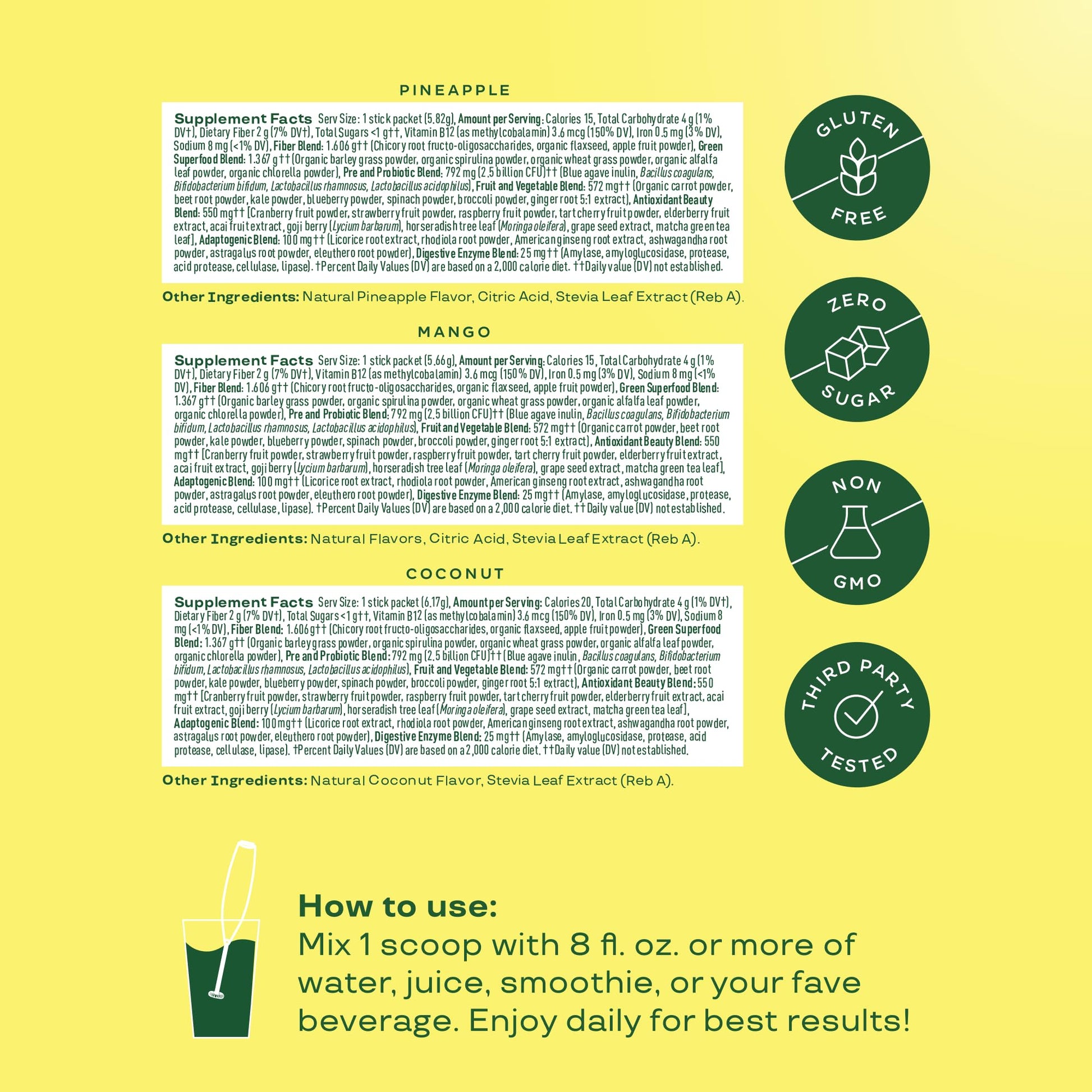 - Daily Greens Routine: Greens taste amazing, making it easy to stay consistent and feel your best. Add it to a smoothie, mix it into juice or water, or put it in your favorite recipes for an instant upgrade to your daily wellness routine.