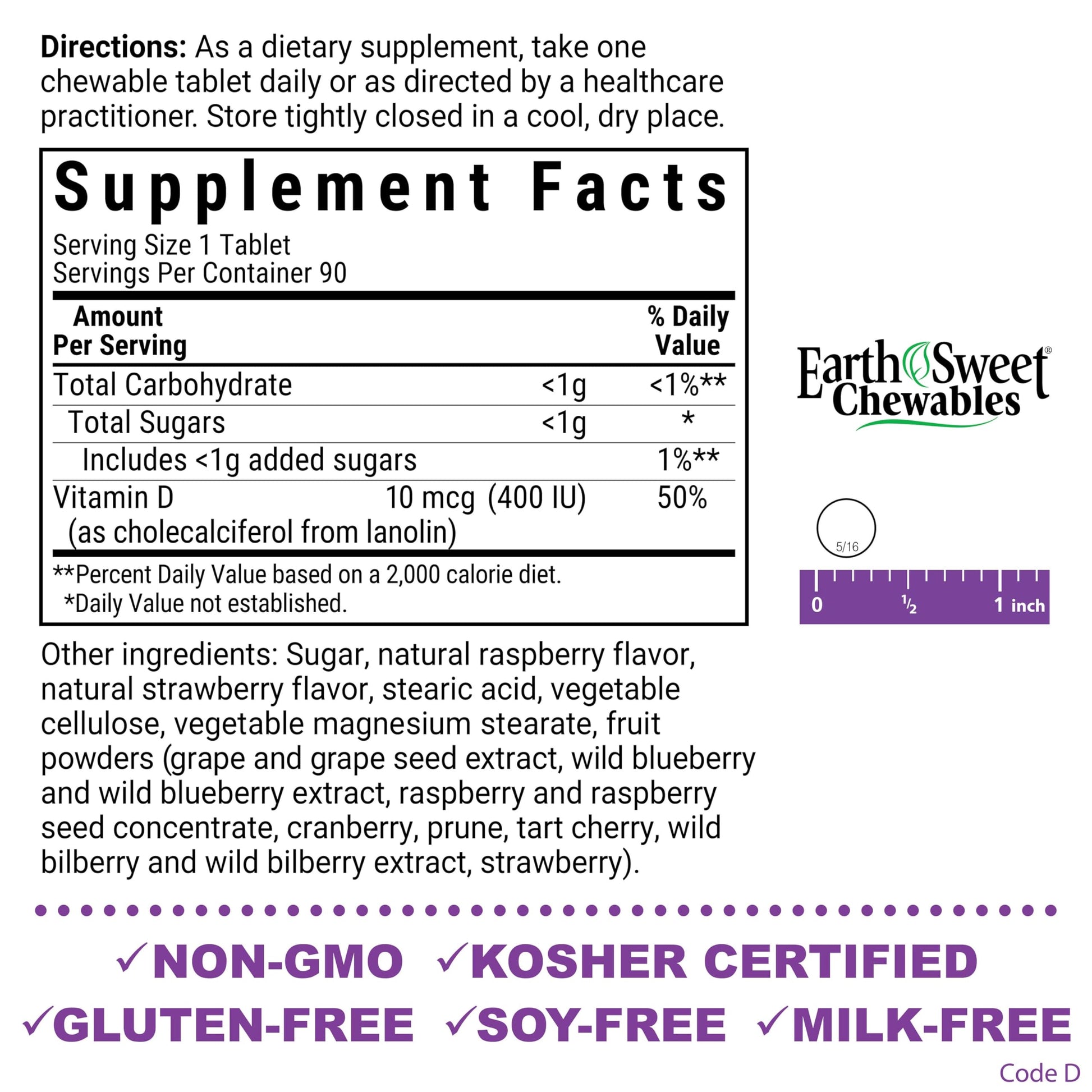 - 400 IU of Vitamin D3 from Lanolin Raspberry Flavored, Chewable Tablets are Sweetened with EarthSweet