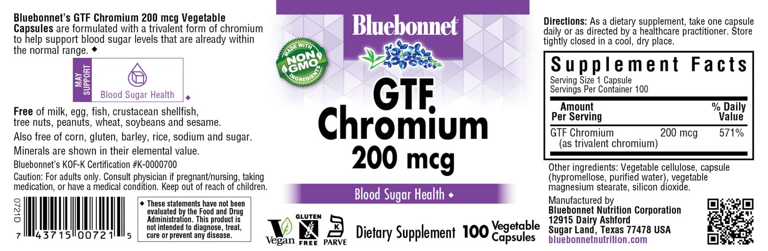 Details: Bluebonnet's GTF Chromium 200 mcg Vegetable Capsules are formulated with a trivalent form of chromium that may help to maintain glucose levels that are already within normal range.*