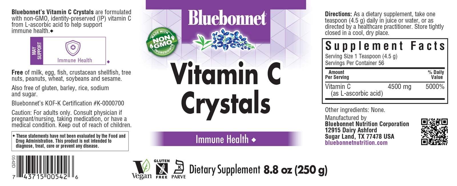 Details: Bluebonnet’s Vitamin C Crystals are formulated with non-GMO, identity preserved (IP) vitamin C from L-ascorbic acid to help support immune health. ♦