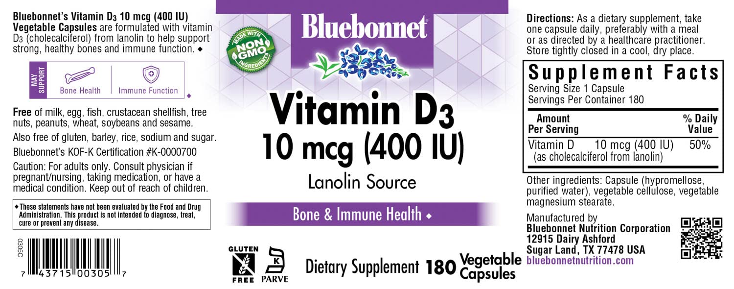 Details: Bluebonnet's Vitamin D3 10 mcg (400 IU) Vegetable Capsules are formulated with vitamin D3 (cholecalciferol) from lanolin to help support strong, healthy bones and immune function. ♦