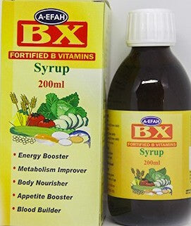 BX Syrup is a fortified B vitamin preparation indicated for adults and children. The B vitamins in BX work together to improve many metabolic processes in the body and helps to improve proper body function. Together with Zinc the B vitamins in BX work to enhance proper cell division, and therefore are very useful in promoting appropriate growth, especially in children. They also prevent the characteristic syndromes that occur as a result of their deficiency such as anaemia, scurvy, pellagra, beri-beri, megaloblastosis, ariboflavinosis, etc.