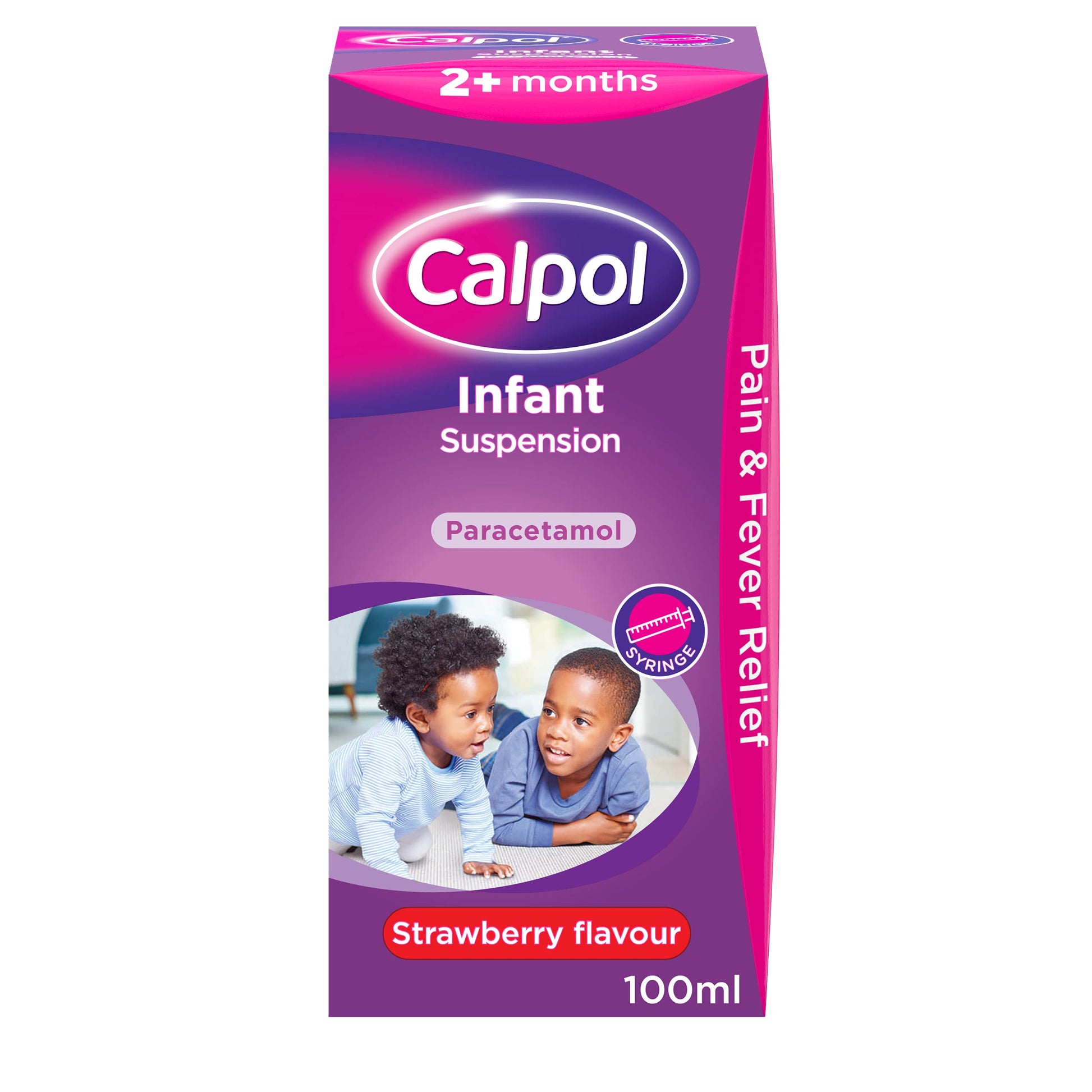 Calpol Infant Suspension is a strawberry flavoured oral suspension and is used for the relief of: Fever (raised temperature), post-immunisation fever, cold and flu symptoms, teething, headache, sore throat, earache and other aches and pains. This product is intended for use in children aged 2 months to 6 years. Contains Paracetamol. Do not give this medicine with any other paracetamol-containing products. Immediate medical advice should be sought in the event of an overdose, even if the child seems well. If symptoms persist consult your doctor. As with all medicines, if your child is currently taking any other medicine consult your doctor or pharmacist before using this product. Please see leaflet. Keep out of the reach and sight of children. Check that the cap on the bottle is securely engaged at all times.