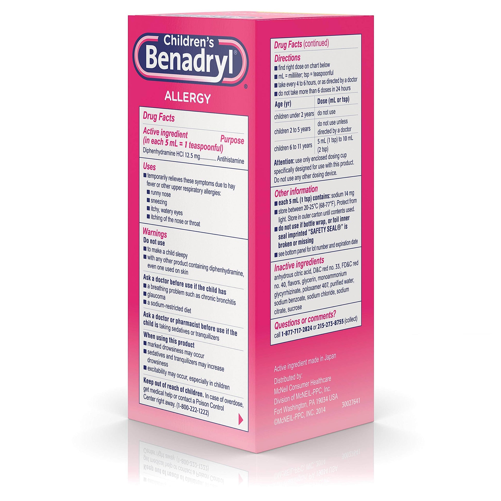 - Children's Benadryl Allergy Liquid in cherry flavor is specially formulated to provide temporary relief of allergy symptoms caused by hay fever and other upper respiratory allergies
