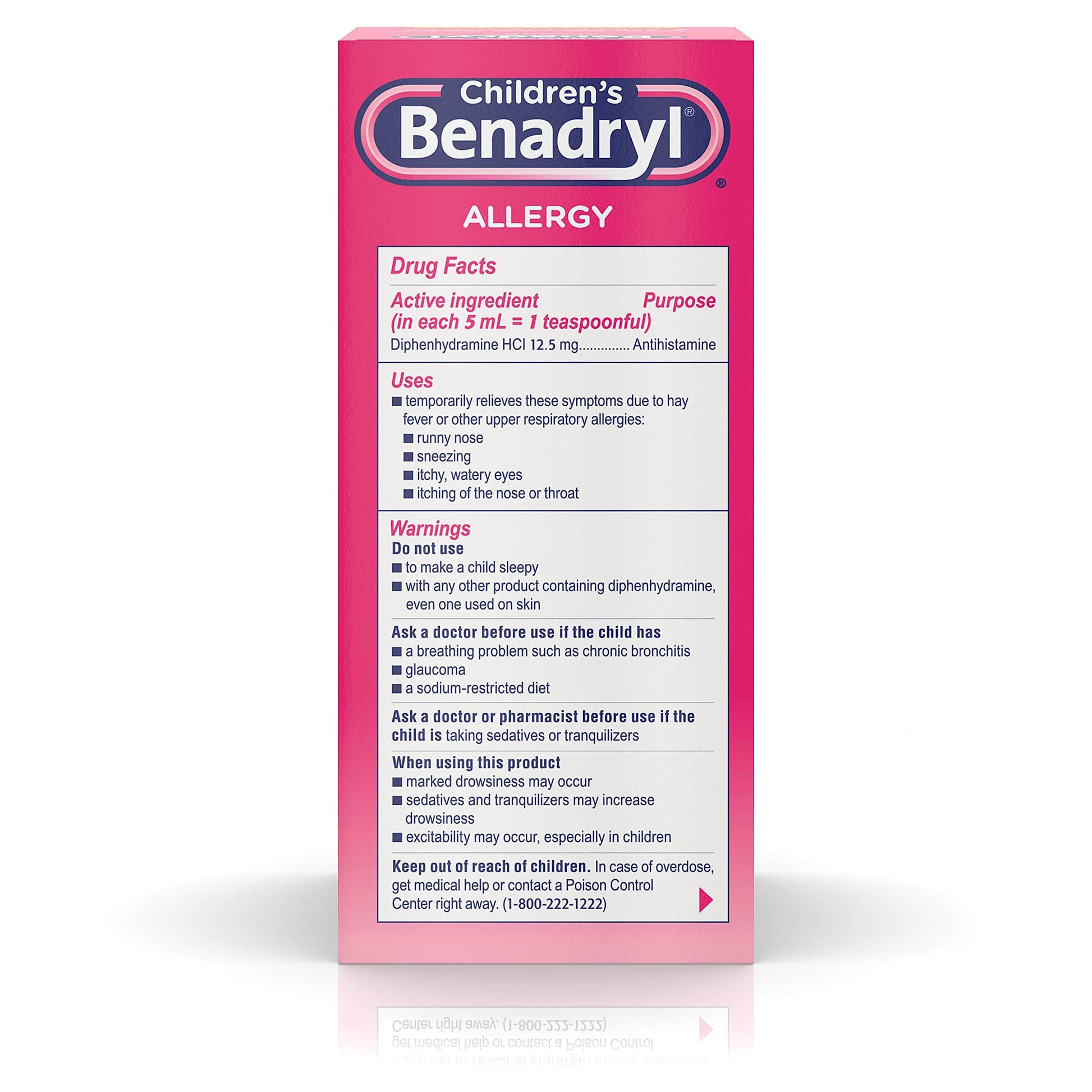 - This allergy medicine for kids contains 12.5 mg of diphenhydramine HCl per teaspoon (5 mL) dose, an antihistamine that works to help alleviate children's allergy symptoms so they can start feeling more like themselves