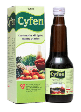 Cyfen Syrup contains Vitamins , Calcium, essential amino acids, L-lysine Hcl, and Cyproheptadine Hcl. It serves as an appetite stimulant.
