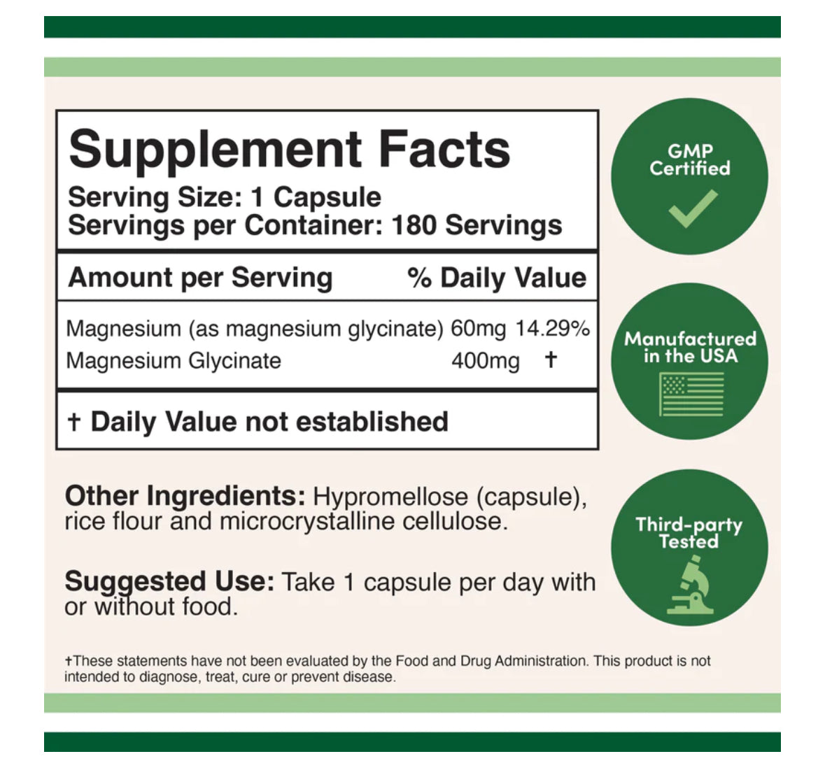 Magnesium Glycinate consists of 15% elemental magnesium by weight, so each 400 mg capsule contains 60 mg of elemental magnesium.