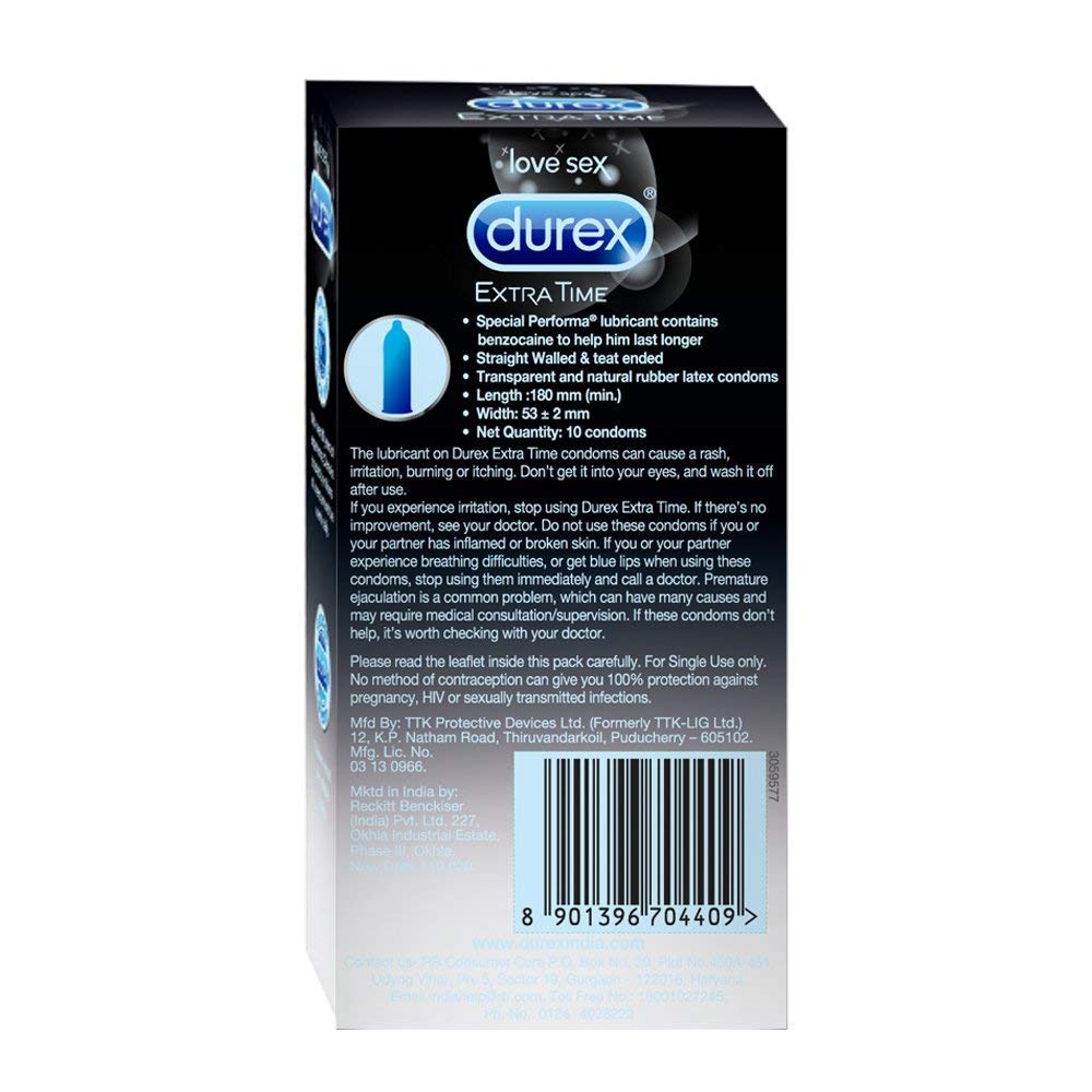 Enhance the intimacy of your special moments with the Durex Extra Time condoms. These condoms contain special climax-control lubricant, benzocaine, that helps him last longer while providing the same level of reassurance and protection as a regular condom. The condoms also smell better which helps avoid unpleasant distractions and you can relax and enjoy to the fullest. Each Durex condom is dermatologically tested to ensure strength and a high level of protection. No method of contraception can give you 100% protection against pregnancy, HIV or sexually transmitted infections. Please read the instructions, especially when using condoms for anal or oral sex. Try different Durex condoms or indulge in Durex’s Play range of lubricants and ring to make love-making comfortable and exciting!