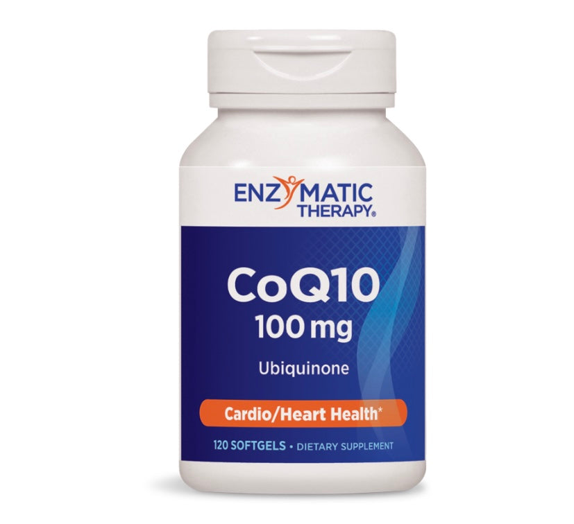 Enzymatic Therapy CoQ10 100 mg supports cardiovascular health and cellular activity.