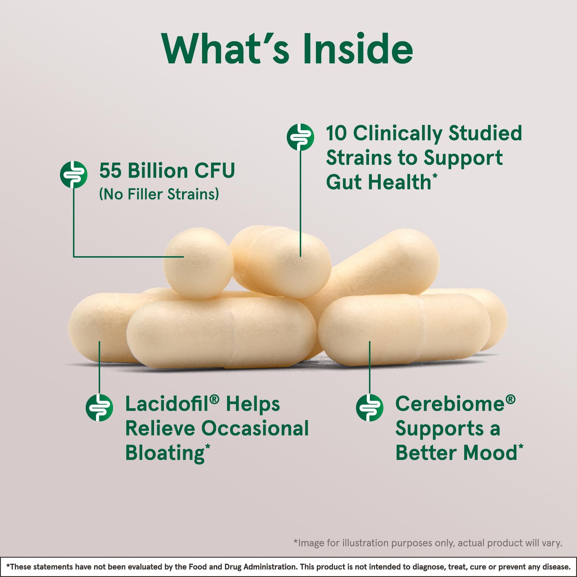 - 10 Strains of Probiotic Bacteria: Delivered via proprietary enteric coated capsules, the probiotics are protected from stomach acid and deliver the potency of friendly bacteria needed to support a healthy gut for up to adult digestive support