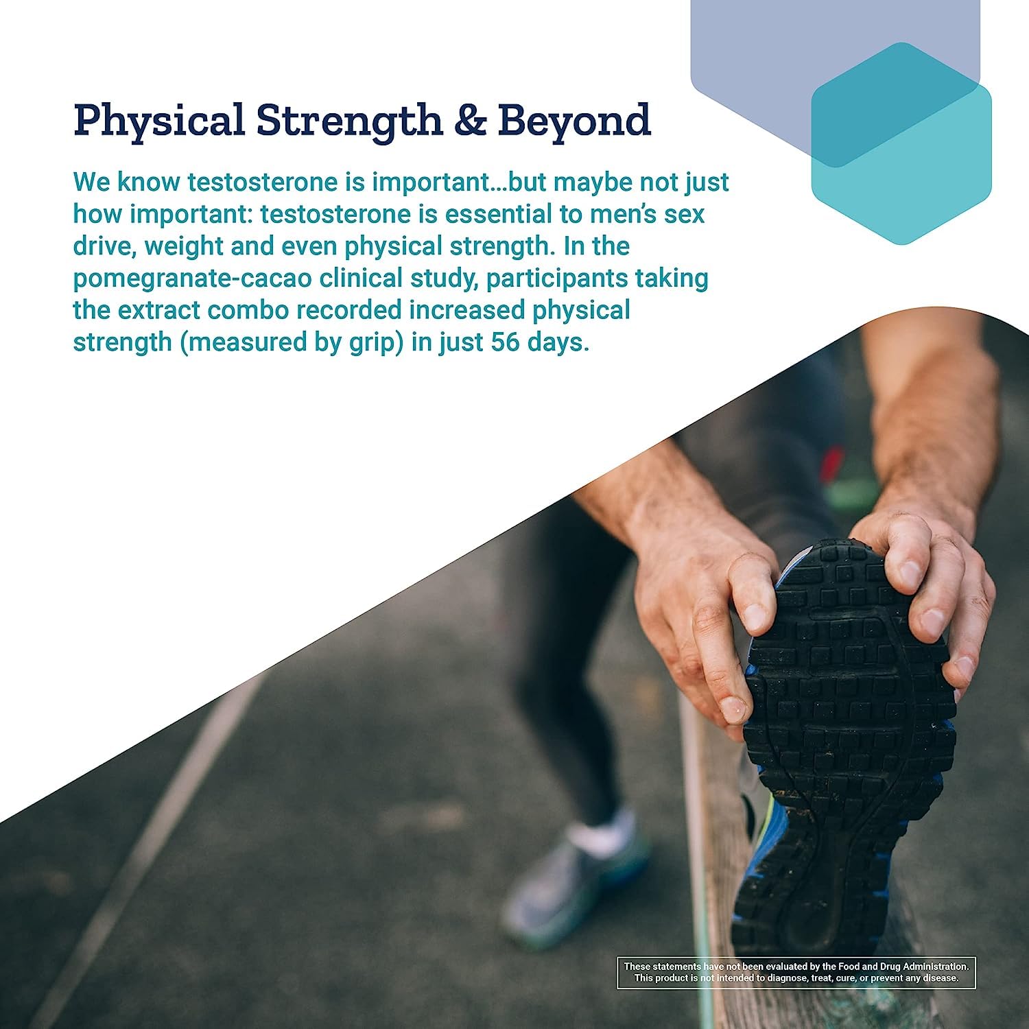 - PHYSICAL STRENGTH & BEYOND–We know testosterone is important...but maybe not just how important: testosterone is essential to men’s sex drive, weight and even physical strength. In the pomegranate-cacao clinical study, participants taking the extract combo recorded increased physical strength (measured by grip) in just 56 days.