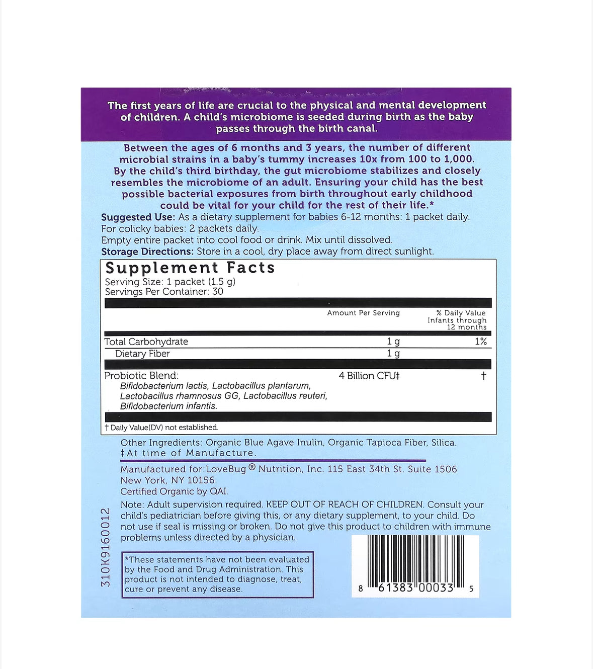 As a dietary supplement for babies 6-12 months: 1 packet daily. For colicky babies: 2 packets daily.