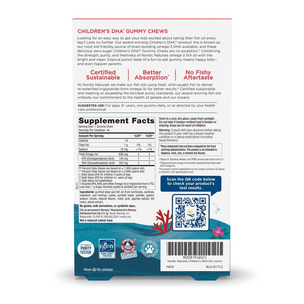 - BETTER ABSORPTION, BETTER TASTE - All Nordic Naturals fish oils are in the triglyceride form (the form naturally found in fish) for optimal absorption. Children’s DHA Gummies have a great tropical punch taste.