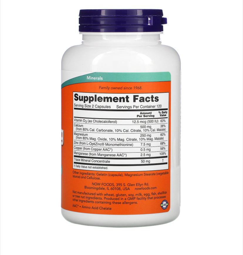 NOW® Cal-Mag Caps contains the minerals that are essential for bone health. In addition to Calcium and Magnesium, Cal-Mag Caps provide chelated, highly absorbable forms of Zinc, Copper and Manganese, three trace minerals known to support healthy bone metabolism. Vitamin D has also been included to support Calcium metabolism.