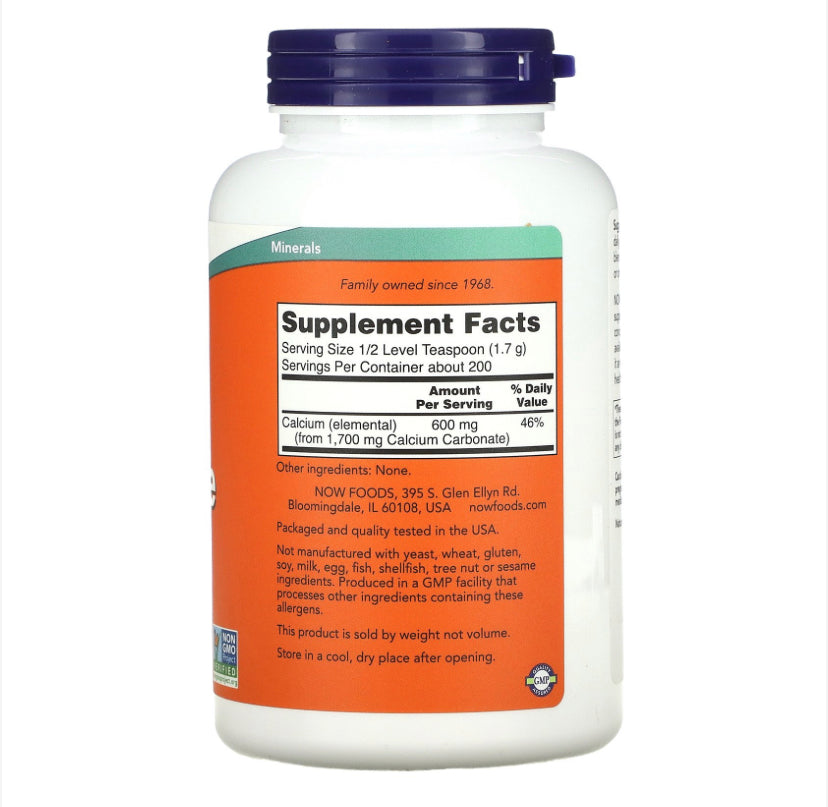 NOW® Calcium Carbonate is a calcium supplement containing one of the highest concentrations of elemental calcium available. Its high calcium content makes it an excellent form for the support of healthy bones and teeth.