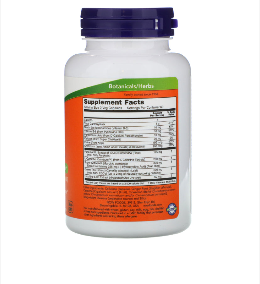 NOW Diet Support features ForsLean, a unique extract of Coleus forskohlii, and Super Citrimax, a unique (-)-hydroxycitric acid (HCA) extract naturally derived from the Garcinia cambogia fruit. Each of these ingredients has been shown to promote healthy fat utilization, especially when combined with a balanced diet and exercise program. Carnipure L-Carnitine, a non-essential amino acid, facilitates the transfer of fats into the mitochondrial membrane for use in cellular energy production. To complete the formula, NOW Diet Support includes essential nutrients and Green Tea Extract for metabolic support.